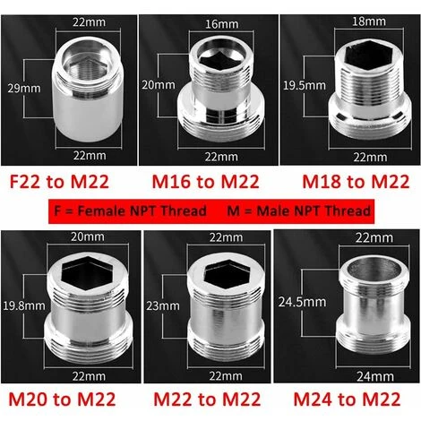 Misure disponibili: adattatore con filettatura esterna da 16/18/20/22/24 mm a adattatore con filettatura esterna da 22 mm (per favore fare riferimento alla descrizione delle dimensioni)