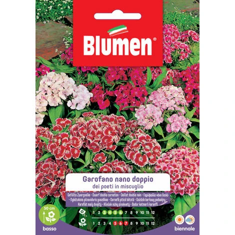 Garofano nano doppio dei poeti in miscuglioPianta biennale dai fiori doppi, profumati e dai colori vivaci. Indicata per bordure basse, vasi fioriti e come fiore da recidere.Trapianto: si consiglia di trapiantare le piantine quando raggiungono l’altezza di circa 5 cm.