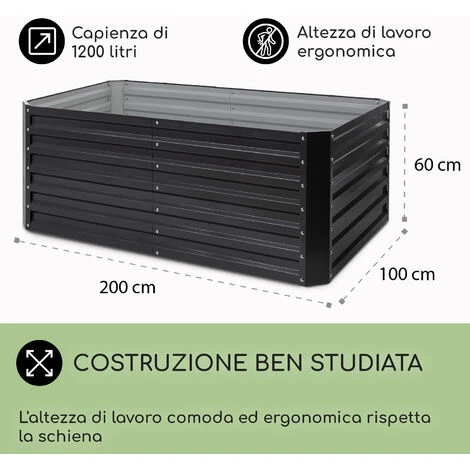 PIÙ SPAZIO, PIÙ PIANTE: questa grande aiuola rialzata misura 200 x 60 x 100cm ed è alta 60 cm. Le sue dimensioni consentono di piantare all’aperto un grande appezzamento di cetrioli, pomodori, basilico, fragole, rose, fiori, erbe e altre verdure.