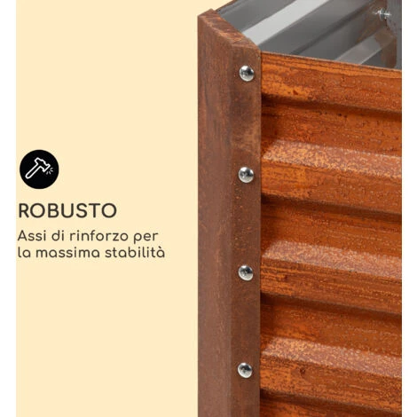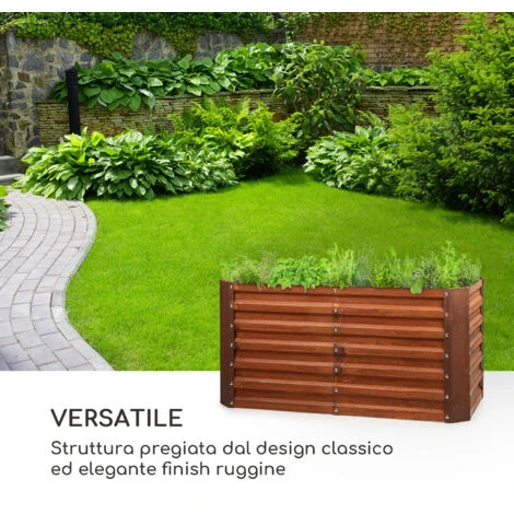 Grazie alle condizioni di crescita ideali, coltivare pomodori succosi, dolcissime fragole, zucchine croccanti ed erbe aromatiche sarà un vero gioco da ragazzi. Il telaio in lamiera d’acciaio ondulata e zincata dell’aiuola da giardino è stabile e resistente alle intemperie. Rust Grow affronta a testa alta vento e pioggia. L’elegante finitura effetto ruggine completa sapientemente l’aspetto dell’aiuola rialzata.