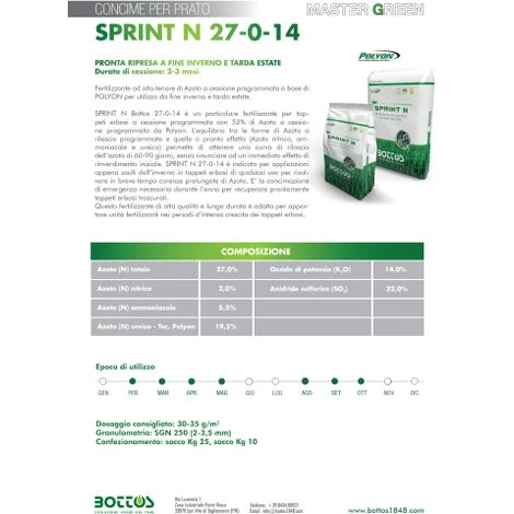 SPRINT N Bottos 27-0-14 e’ un particolare fertilizzante per tappeti erbosi a cessione programmata con 52% di Azoto a cessione programmata da Polyon. L’equilibrio tra le forme di Azoto a rilascio programmato e quelle a pronto effetto (Azoto nitrico, ammoniacale e ureico) permette di ottenere una curva di rilascio dell’azoto di 60-90 giorni, senza rinunciare ad un immediato effetto di rinverdimento iniziale.
