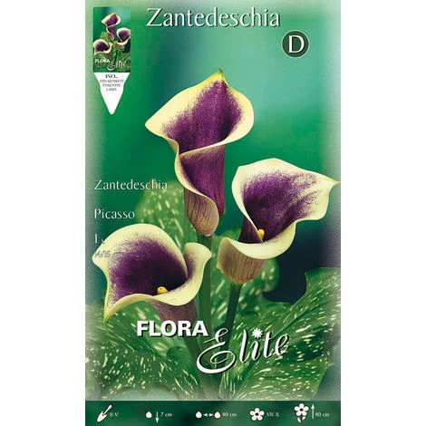 La Calla Zadenteschia Picasso raggiunge fino a 40 cm e fiorisce da luglio fino a settembre. Idonea come fiore reciso, ma anche per la crescita in vasi, fioriere e vasi di terracotta. Coltivazione: piantare quanto prima e proteggere dal gelo A 10 cm di profondità a intervalli di 40 cm.Suggerimento: Una fioritura precoce può essere ottenuta coltivando la pianta in ambienti chiusi a febbraio-marzo. Descrizione Prodotto: 1 bulbo calibro 14/16Colore: Viola bordi gialliMese Piantagione: 2-3-4-5Mese FIoritura: 6-7-8-9-10Altezza 40 cmLuce: Sole, mezz’ombraProfumo: NoRecidere: Si.