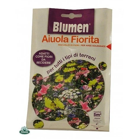 Miscuglio di fiori per tutti i tipi di terre annuali e crusca di grano saraceno, un materiale inerte, biodegradabile, che ha lo scopo di facilitare la distribuzione del seme sul terreno. Ideale per creare in giardino aiuole e angoli decorativi. Le varietà che lo compongono sono adatte ad essere coltivate anche nei terreni più difficili. Copertura terreno: 5m2. Altezza fiori: dai 40 ai 50cm. Semina: da marzo a giugno. Fioritura: da maggio a ottobre. Specie e varietà contenute all’interno della bustina: rudbeckia hirta, ammi majus, adonis aestivalis, calendula officinalis, centaurea cyanus, centaurea imperialis, cheiranthus allionii hort, chrysanthemum segetum, clarkia unguiculata, coreopsis tinctoria, delphinium consolida, dimorphoteca sinuata, echinacea purpura, eschscholtzia californica, godetia glandiflora, gypsophila elegans, iberis amara, lavatera trimestris, linaria maroccana, maloper trifida, malva moschata, nemophila menziesii hook, cosmos bipinnatus, papaver orientale, papver roheas, phlox drummondii hook. (in percentuali variabili). Peso bustina: 50gr. circa.