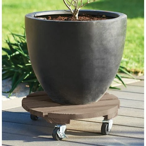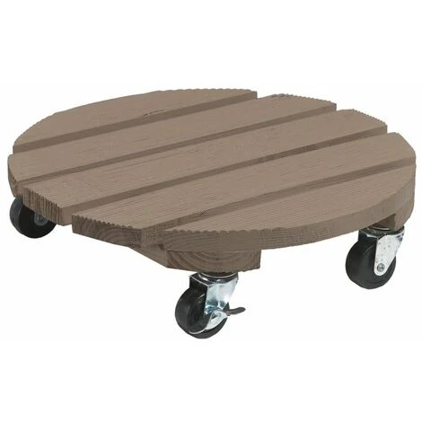 Supporto a; ruote in legno verniciato per spostare facilmente oggetti di grandi dimensioni, come vasi di fiori.