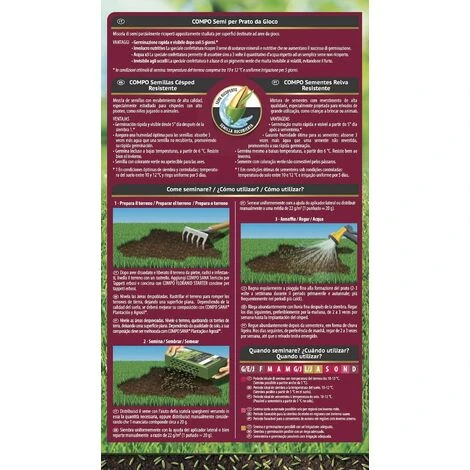 - Seminare: distribuire il seme con l’aiuto della scatola spargisemi versando in essa la quantità necessaria oppure distribuirlo manualmente considerando che una manciata corrisponde circa a 20 g; una scatola da 1 kg realizza 50 m2di prato.