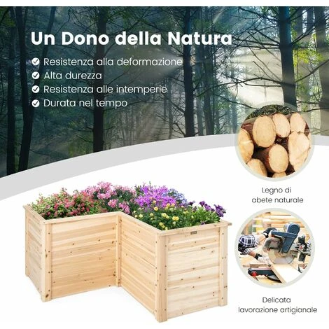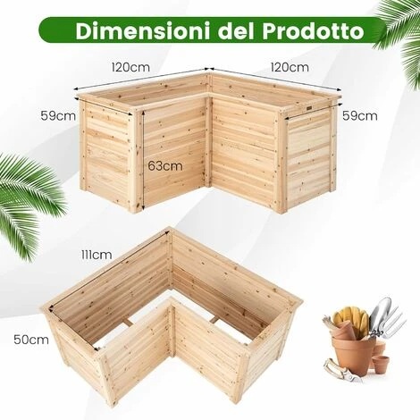Rendi più facile il tuo lavoro di giardinaggio! La nostra fioriera da giardino a forma di L ti permette di coltivare varie piante, come fiori, erbe, verdure, frutta e altro ancora. Grazie alla sua altezza, il nostro fioriera è perfetta per coltivare piante o piantine con radici lunghe. Inoltre, adotta una base aperta, ottima per il drenaggio dell’acqua, la conservazione del terreno e lo sviluppo delle radici. La fioriera è realizzata al 100% in solido legno di abete, che non è facile da deformare o assorbire acqua, garantendo una lunga durata. Inoltre, la superficie in legno color legno offre spazio per l’immaginazione, quindi puoi decorare la tua fioriera da giardino con la tua creatività, creando un’aggiunta perfetta al tuo giardino!