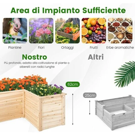 Area di Piantagione Sufficiente: La fioriera da giardino misura 120 x 120 x 63 cm (L x P x A), offrendo ampio spazio per coltivare varie piante. Inoltre, a differenza di altre soluzioni da 25 cm di profondità, la nostra adotta una profondità di 63 cm, adatta per la coltivazione di piante o giovani con radici lunghe.