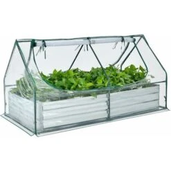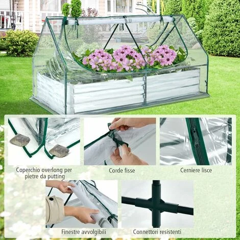 La copertura in PVC è durevole e resistente all’usura, particolarmente utile per creare uno spazio vitale sicuro e tenere le piante al riparo da freddo e pioggia. Inoltre, è dotata di 2 finestre a 2 livelli. Lo strato interno in rete garantisce una buona circolazione dell’aria. Se si aprono le cerniere a due vie, si arrotolano completamente e si fissano con le cinghie, si garantisce un facile accesso alle piante, facilitando l’irrigazione. L’orto da giardino rialzato è realizzato in acciaio zincato da 0,07 cm, per una maggiore robustezza e resistenza alla ruggine.