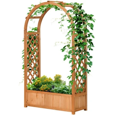 Questa fioriera da esterno Outsunny offrirà un fascino naturale al tuo giardino. La fioriera in legno ti permette di accogliere i tuoi ospiti con le tue bellissime piante, mentre l’arco superiore e il traliccio su entrambi i lati si rivela adatto per i rampicanti e perfetti per le decorazioni e i soprammobili. Grazie al suo design dalle linee chiare, questo traliccio ad arco è un’ottima decorazione per dare un tocco di stile al giardino. Assicurati già oggi questo portafiori di qualità!