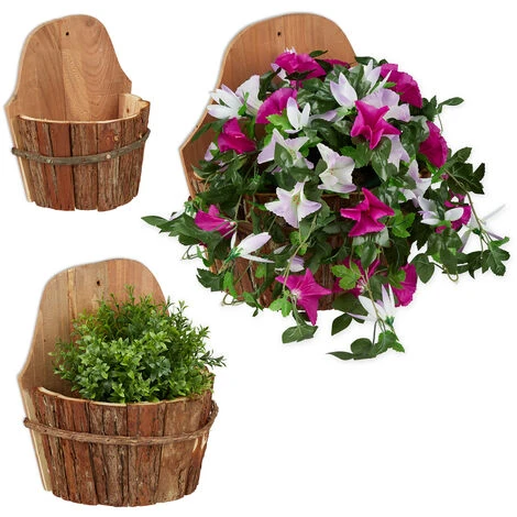 Decorate il vostro giardinocon l’aiuto di questo set da 3 portavasi. La realizzazione in legno e corteccia, dona ai vasi un look unico dallo stile vintage cheattrarrà ogni sguardo sia negli ambienti esterni che interni. Per piantare lepiante direttamente nel vaso, basterà rivestire l’interno con della pellicolatrasparente. La struttura possiede un foro con cui è possibile appendere lefioriere comodamente al muro.