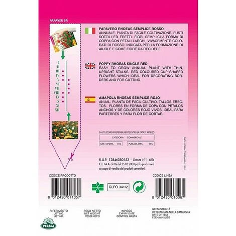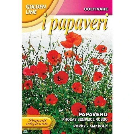Papavero Rhoeas Semplice Rosso. Annuale. Pianta di facile coltivazione. Fusti sottili ed eretti. Fiori semplici a forma di coppa con petali larghi, vivacemente colorati di rosso. Indicata per la formazione di aiuole e come fiore da recidere.