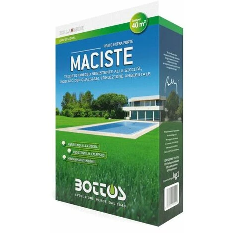 Miscuglio ideale a tessitura mediondash;grossa per aree mediterraneo-continentali, calde, esposte a sud e con evidenti problemi di temperature estive e di rischio di siccità. Maciste è anche la risposta giusta per qualsiasi tipo di terreno, adatto anche all’ombra fino al 50% in meno di luce diretta e perciò indicato perfino all’ombra di conifere. Velocissimo nella fase d’impianto iniziale, colonizza immediatamente gli spazi, non lasciando sfogo alle potenziali essenze infestanti. Tappeto erboso costituito da cultivar di origine americana con colorazione verde brillante anche nella stagione fredda. Tappeto che a piena maturità, si presenta con elevata densità e uniformità. Tollerante alla Macchia bruna estiva. Ideale per la costruzione di tappeti erbosi ricreazionali, ornamentali, ma anche per aree più marginali.