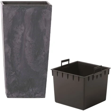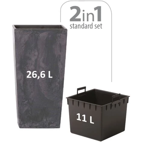 Set 2 in 1: vaso di fiori che include un serbatoio interno adattato che riduce la quantità di terreno richiesta. La pentola ha una capacità totale di 26,6 litri, mentre il serbatoio necessita di 11 litri di terriccio.
